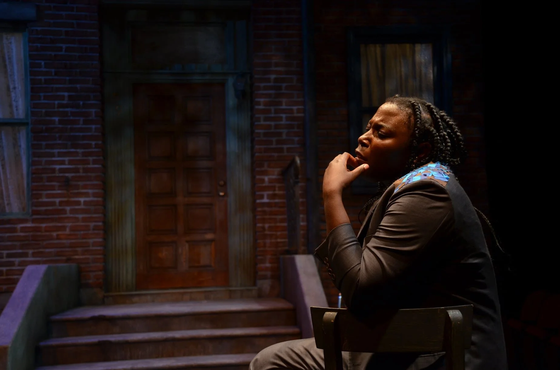 “The shifts from one character to another aren’t marked off by dramatic lighting shifts or other stage effects in director Elizabeth Carter’s smooth and sensitive production, though certainly Jon Tracy’s moody lighting and the street noises and music choices (familiar R&B, jazz) in Ariella Cooley’s sound design help set the scene. And despite the range of characters, Simon remains in the dark casual suit that costumer Regina Evans gives her.”